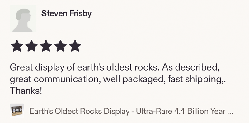 Samples of some of Earth's oldest and rarest rocks, dating up to 4.4 billion years old, in a 6" tabletop display case.