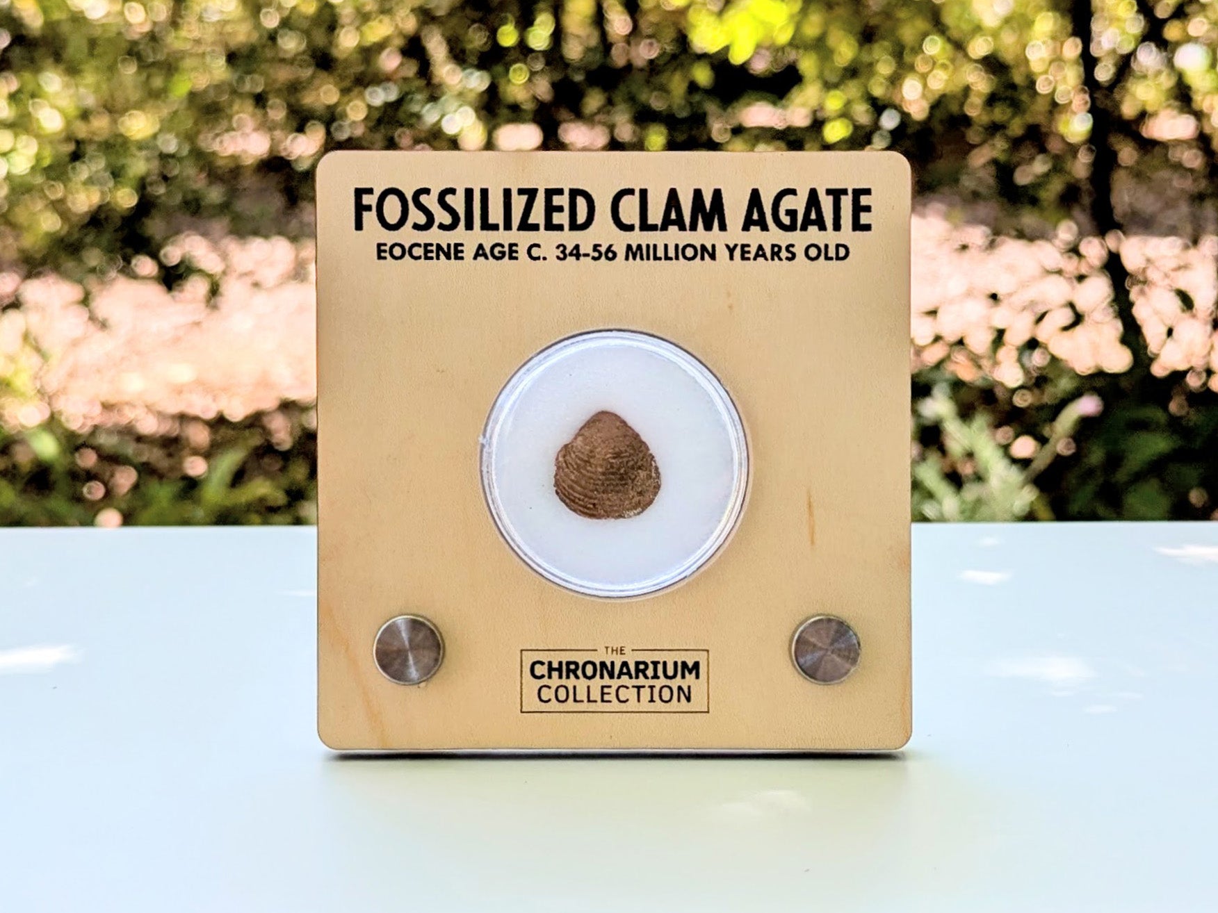 Each fossilized clam is enclosed in a clear jar in an 4" engraved wood display. Whether you're a seasoned fossil collector or a curious beginner, these agate-replaced clams are a beautiful, affordable glimpse into a prehistoric seafloor.