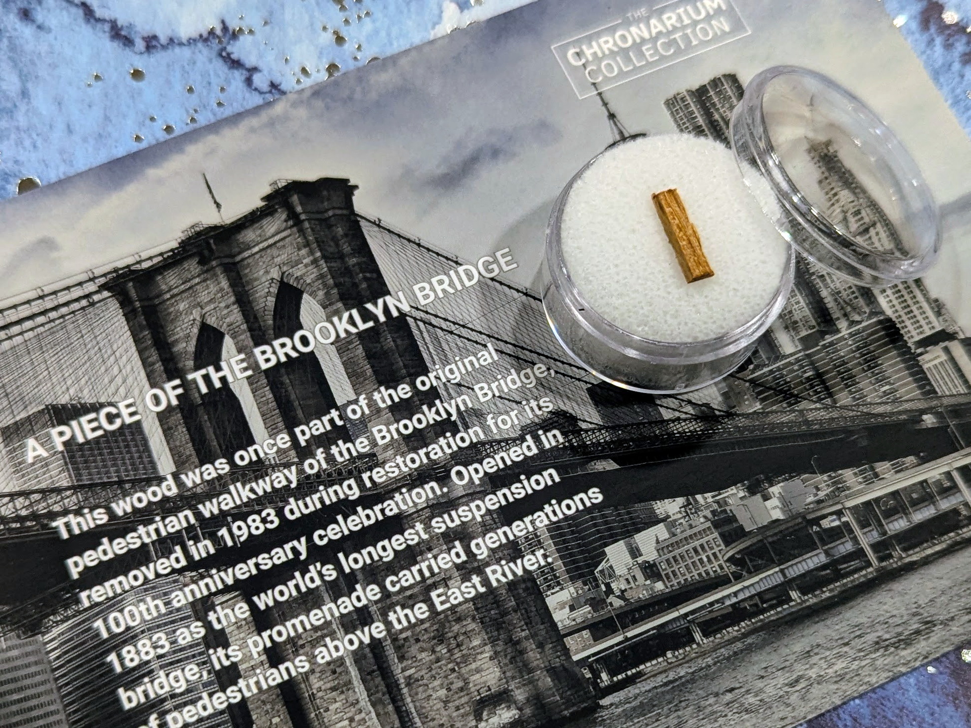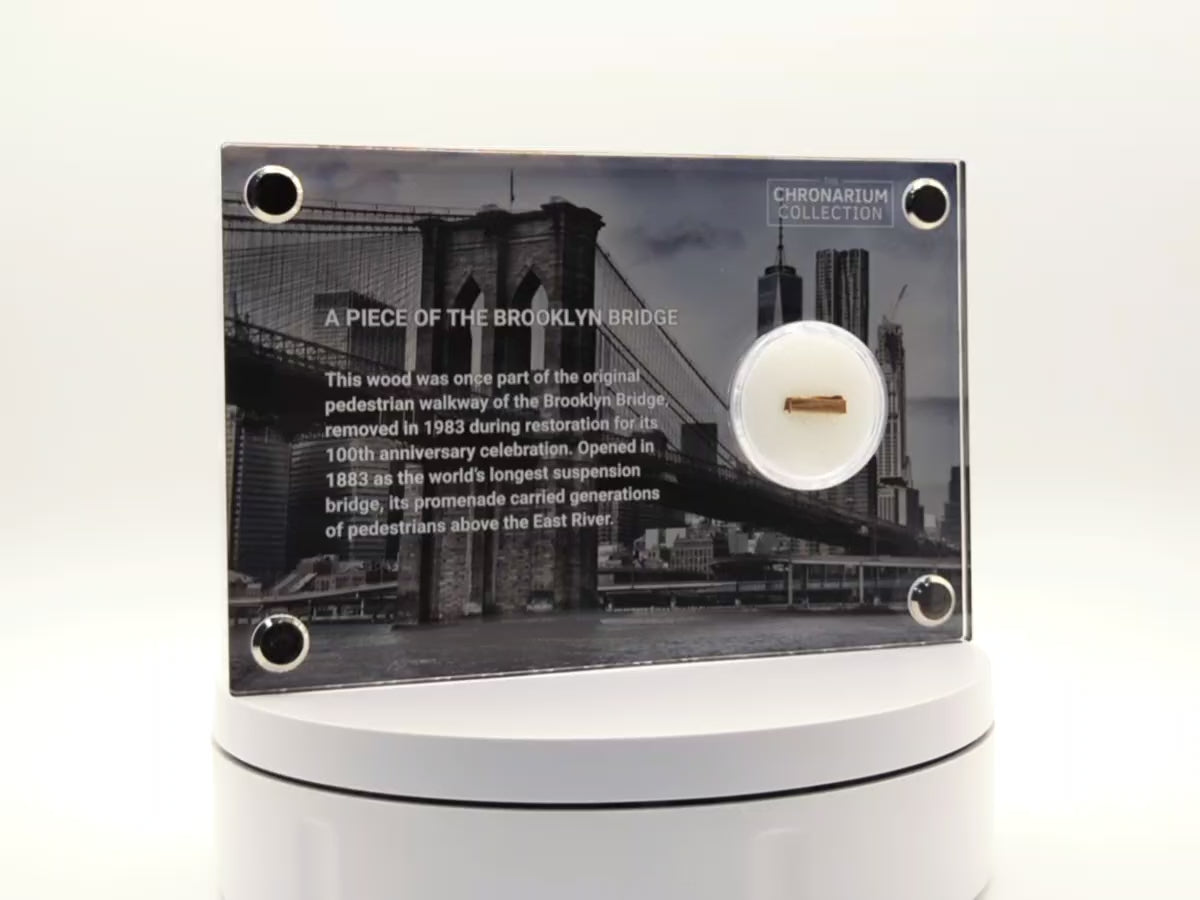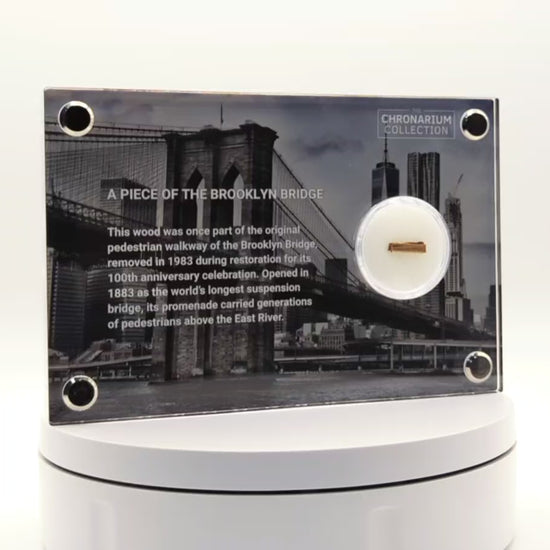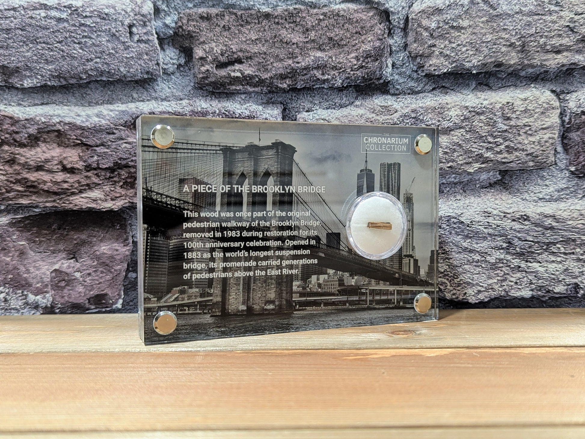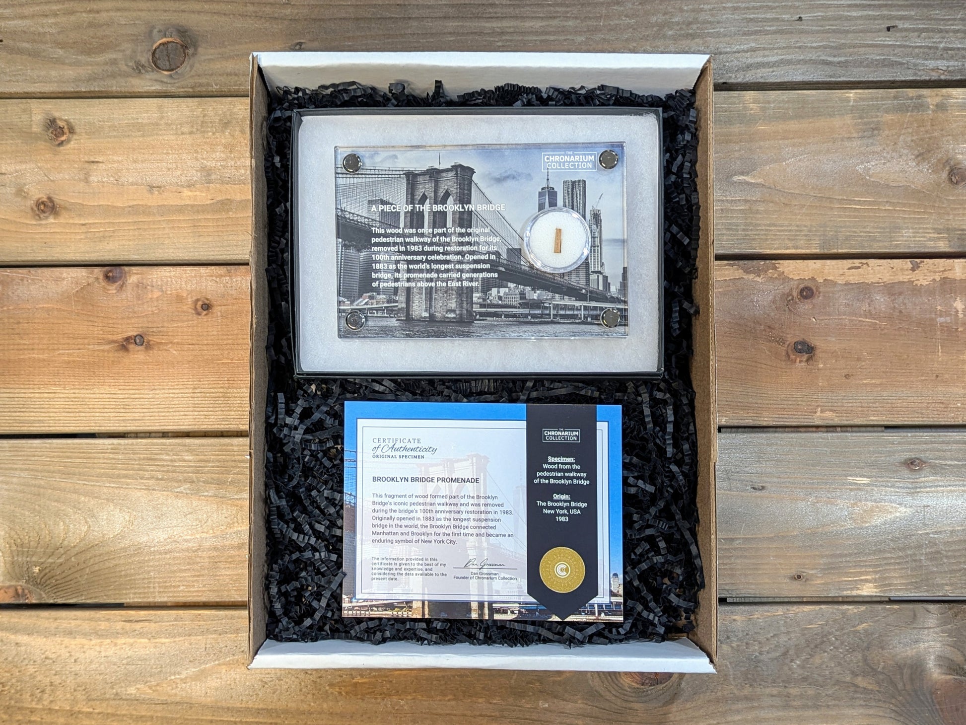 You're looking at a genuine piece of wood from the pedestrian walkway of the Brooklyn Bridge, removed during the bridge's 100th anniversary renovation in 1983. That’s right — this humble slice of timber was once part of the iconic wooden promenade where generations of New Yorkers visitors walked, biked, proposed marriage, roller-skated, or just took in the view of the East River.