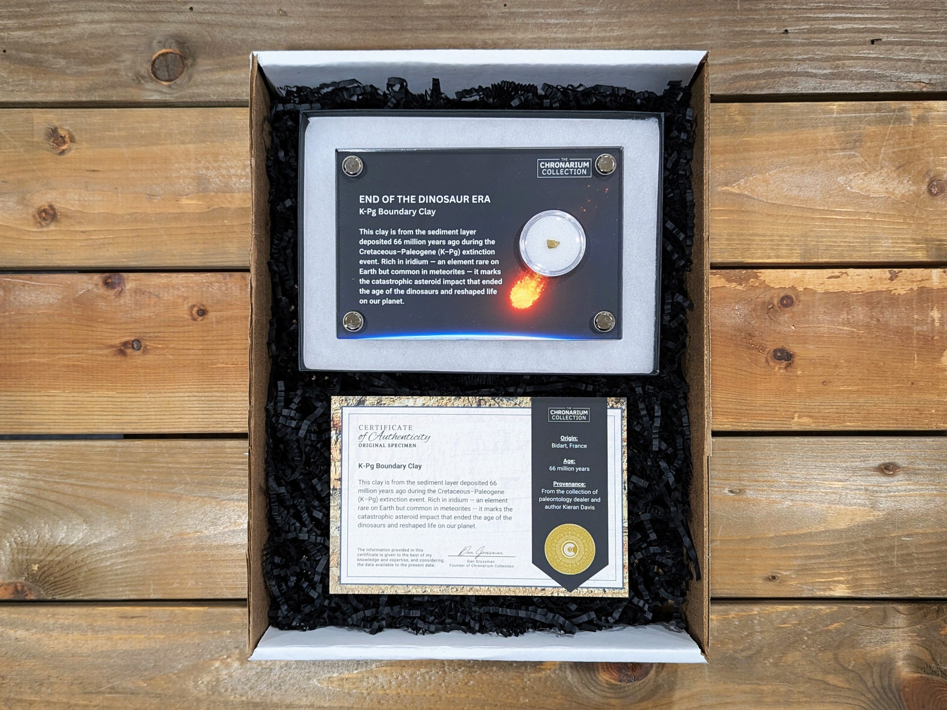 Our samples of this 66 million year old clay come from one of the best-preserved K–Pg transitions found in Bidart, France. The acrylic display contains a roughly 5mm sample in a clear removable jar.