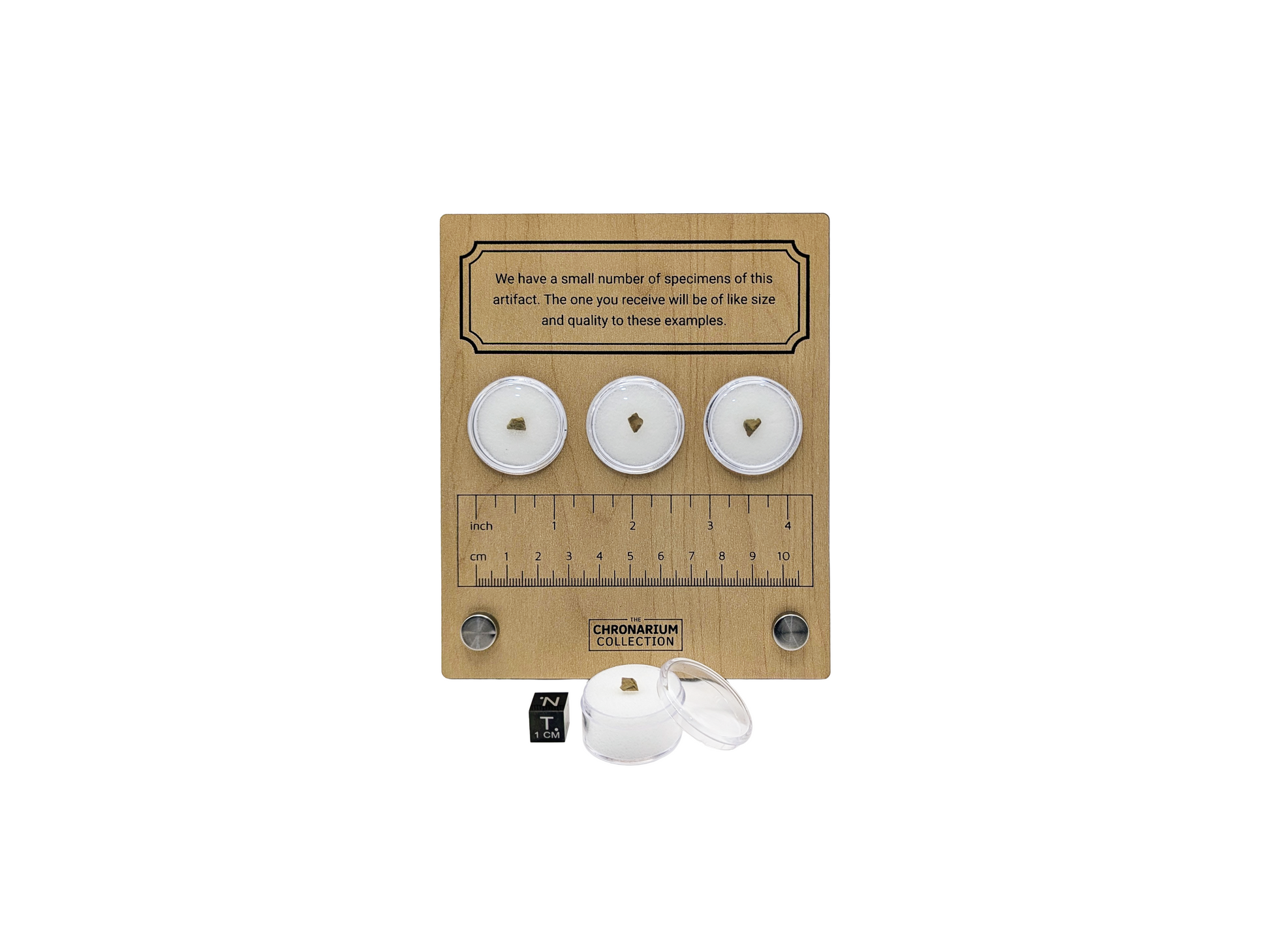 Each specimen is enclosed in a clear protective jar backed by soft foam, which you can open to examine your piece of history.