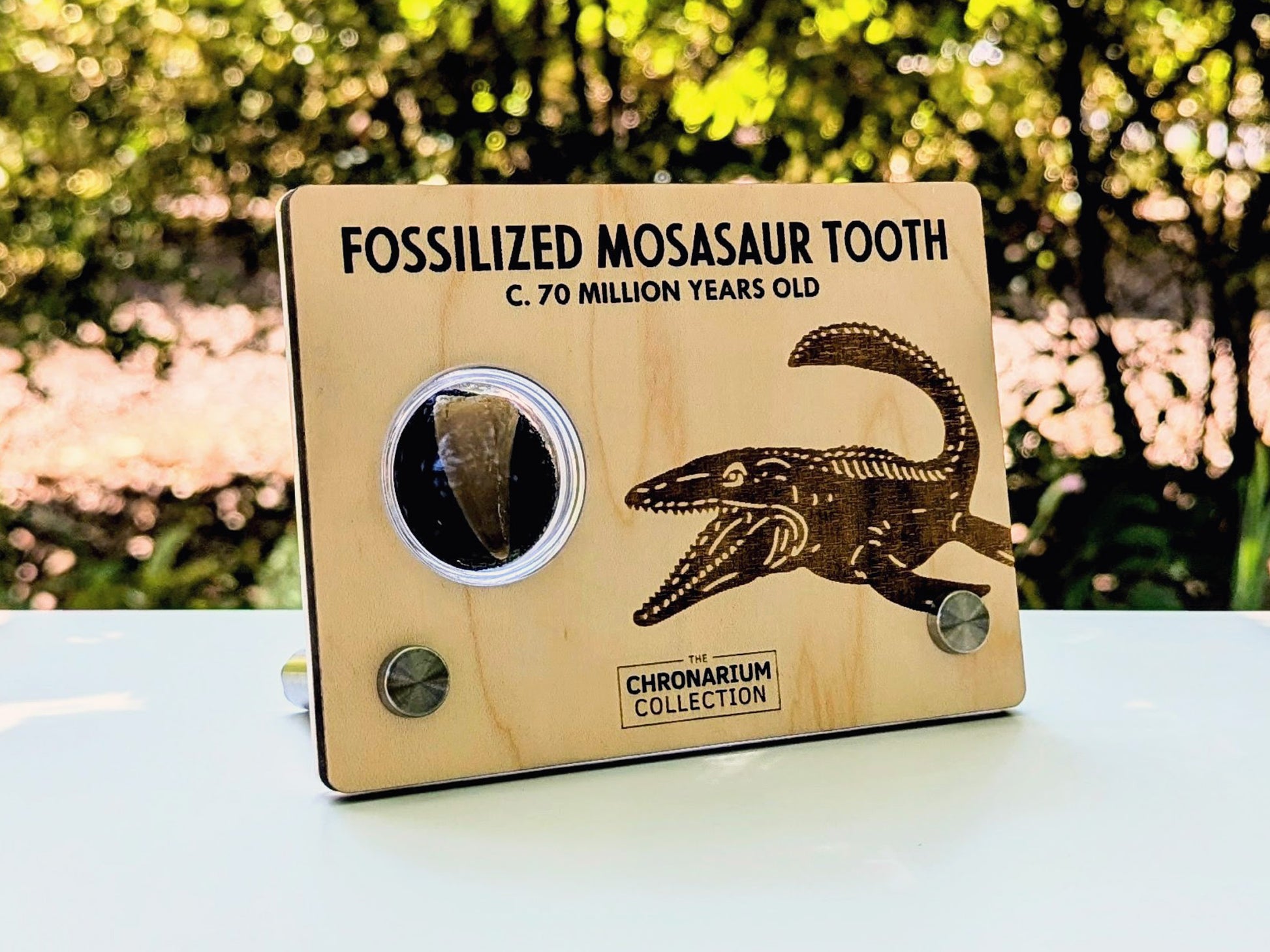 Your fossil is enclosed in a clear jar inside a laser-engraved wood display measuring approximately 5.5" wide. Perfect for collectors, educators, or anyone fascinated by the dinosaurs of the Cretaceous period.