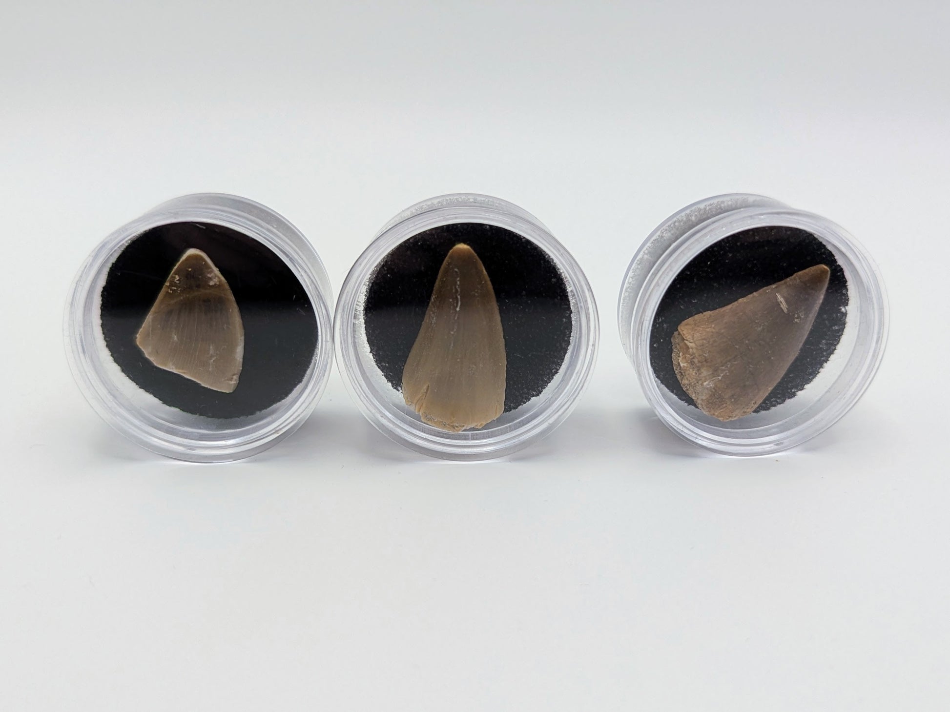 Each fossil tooth was recovered from the phosphate-rich deposits near Khouribga, Morocco, where they're found as a byproduct of large-scale mining. Sizes range from 1/2" to 1 1/4", with most falling in between. Minor imperfections like chipped tips are common and attest to their age and authenticity.