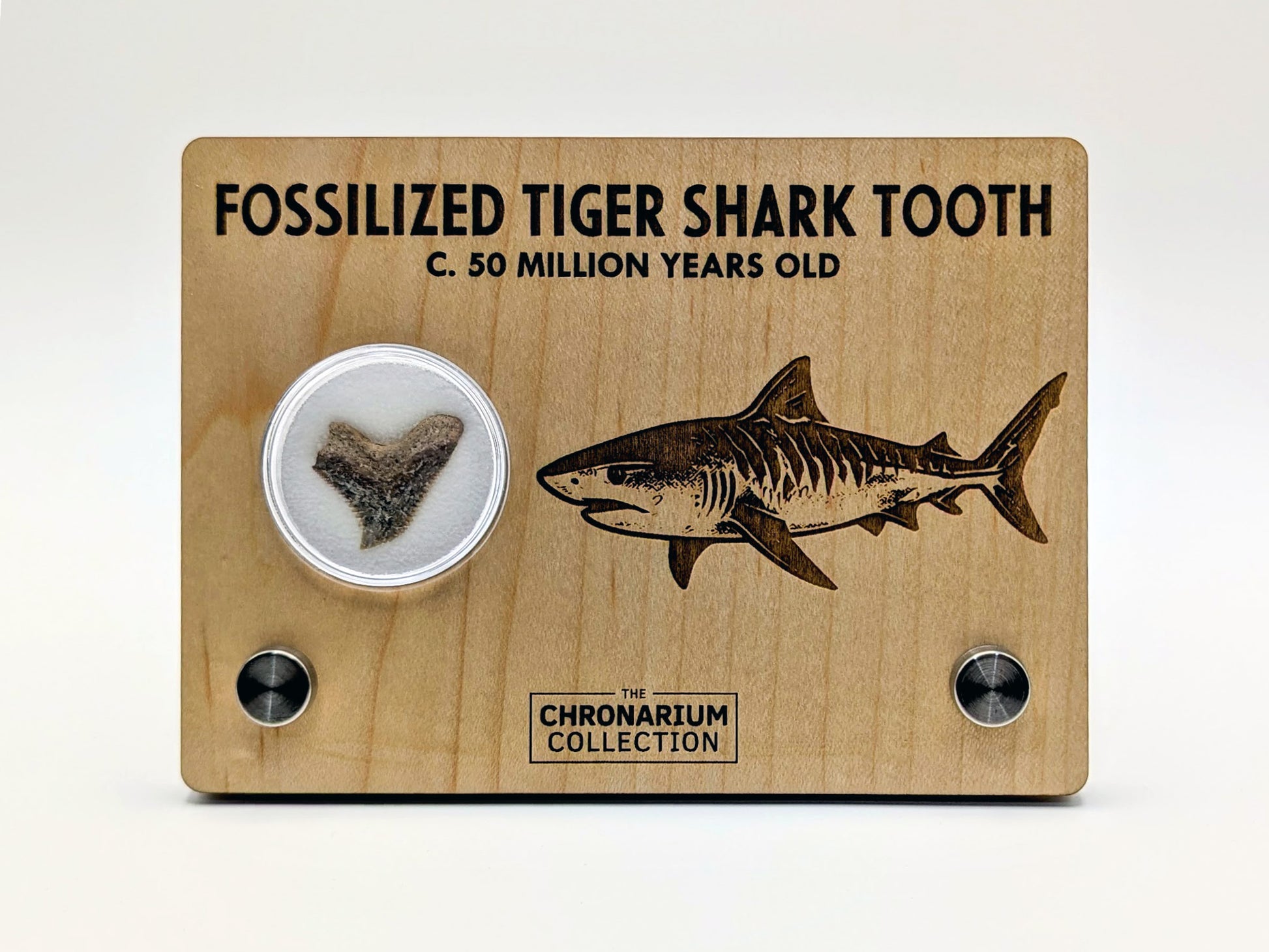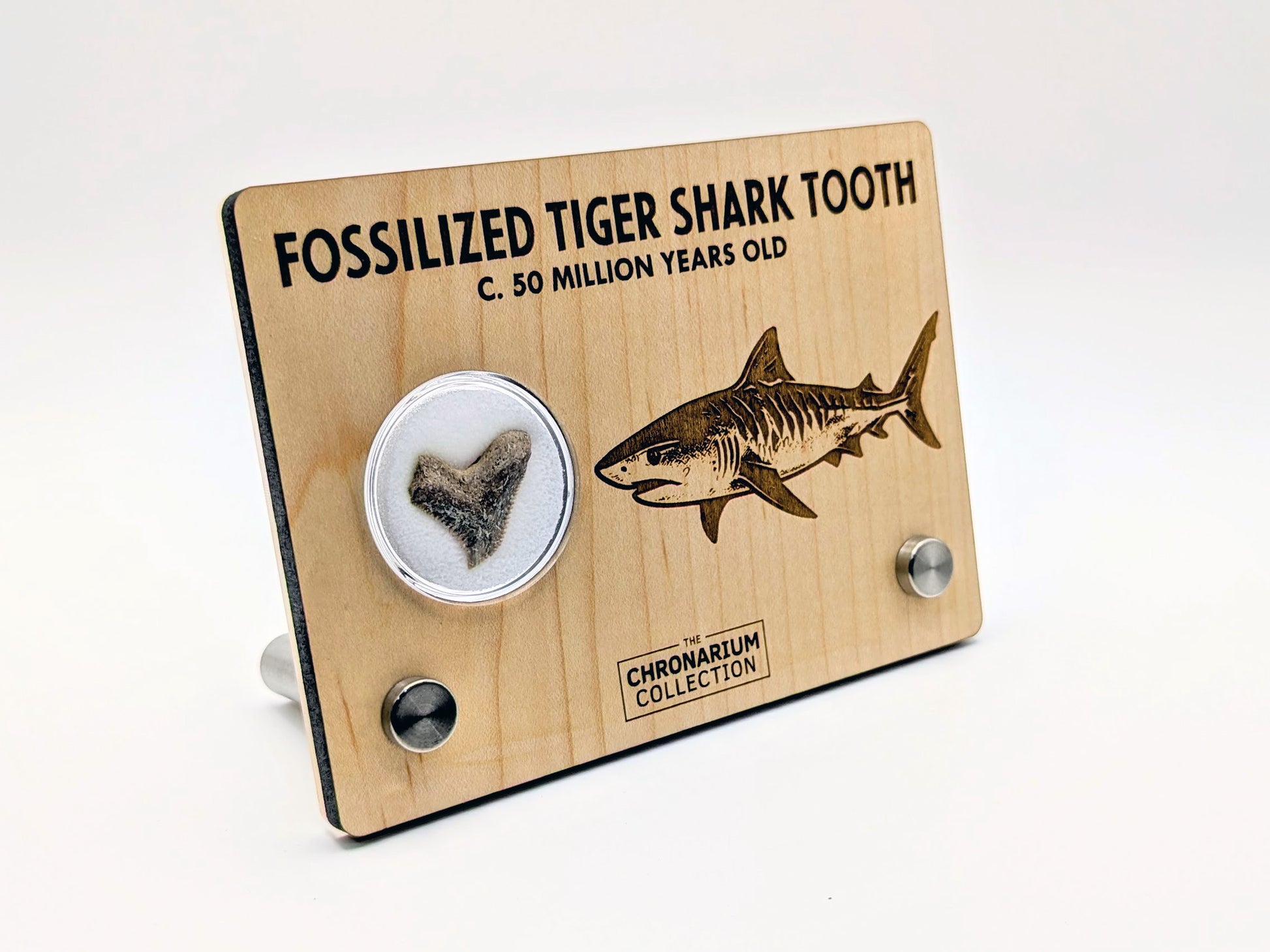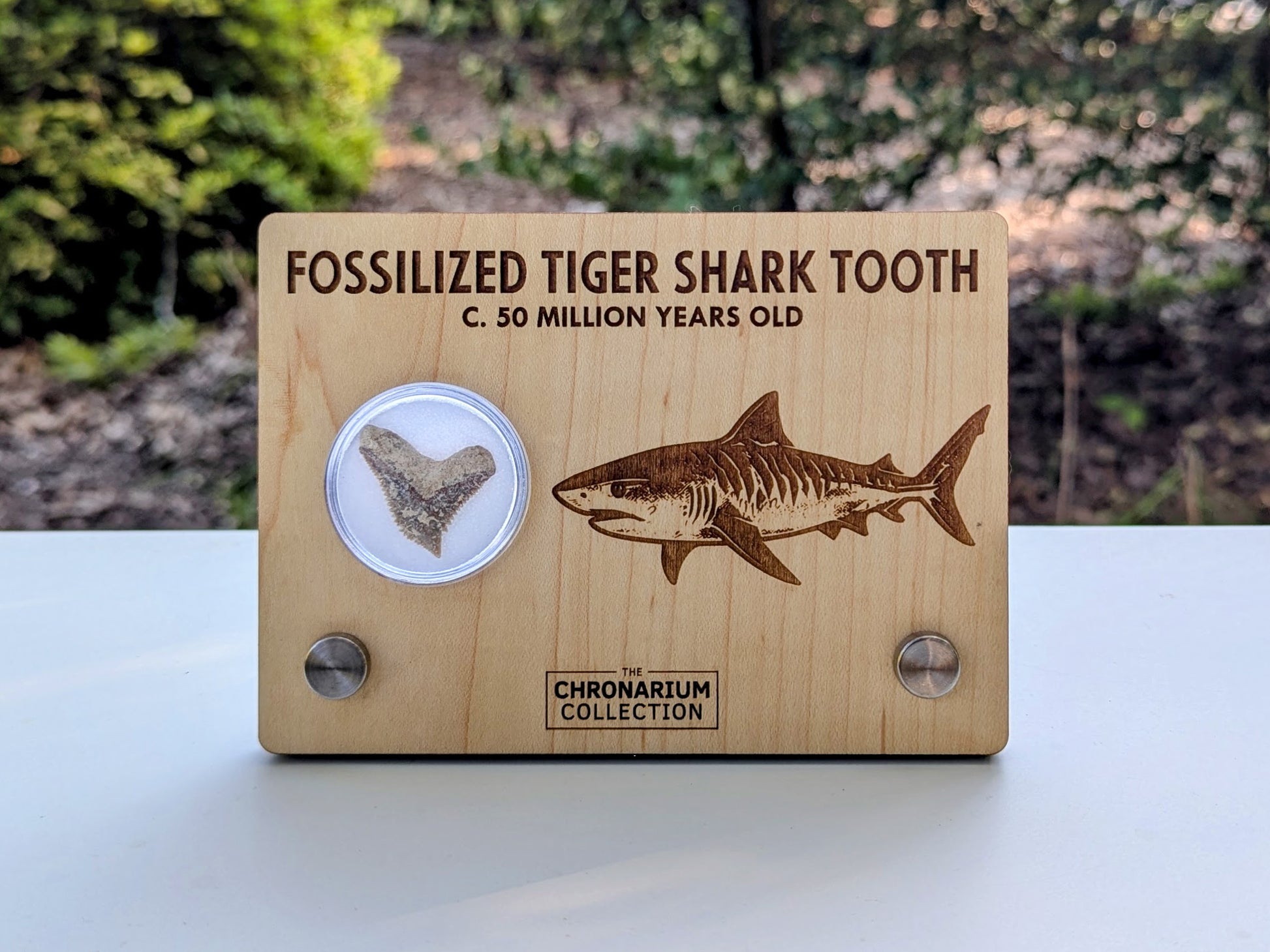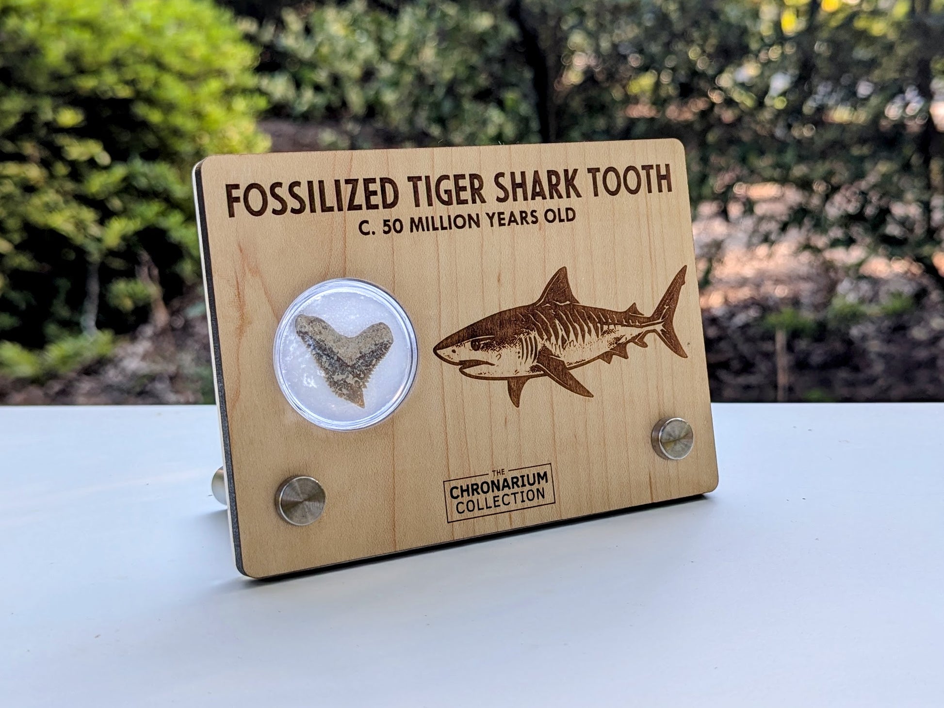 Your fossil is enclosed in a clear jar inside a laser-engraved wood display measuring approximately 5.5" wide. No two teeth are alike — each specimen is a tangible connection to a vanished world, making it an extraordinary addition to any fossil collection or educational display.