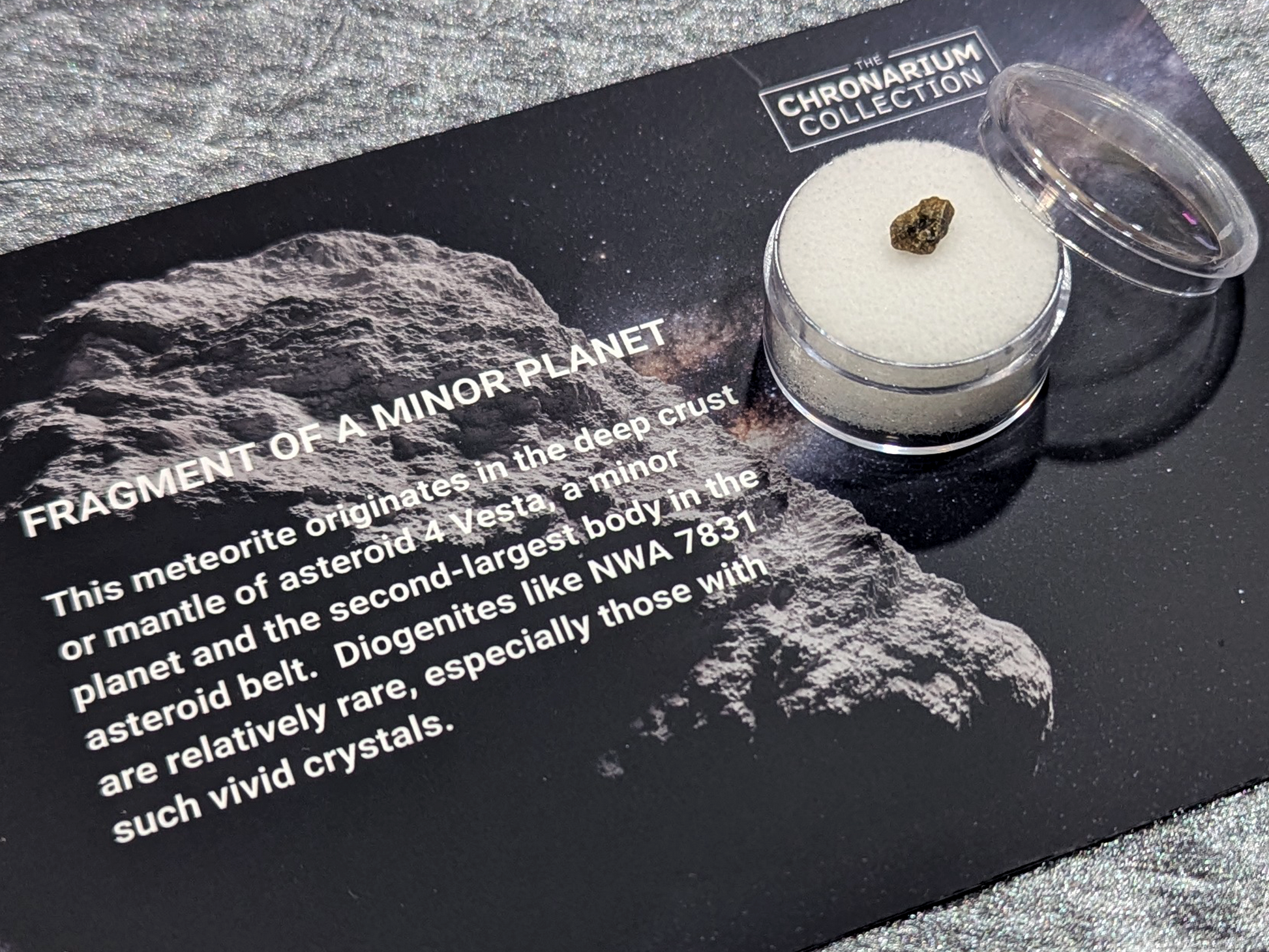 Hold a fragment of a differentiated protoplanetary crust. This specimen is a diogenite-class meteorite: rock that formed deep within the crust of the asteroid 4 Vesta during the early formation of the Solar System. 4 Vesta is a minor planet, the second-largest asteroid, and one of the largest objects in the asteroid belt. Diogenites are part of the HED meteorite group (howardites, eucrites, diogenites) whose compositions match surface materials measured at 4 Vesta, linking these meteorites directly to that world.