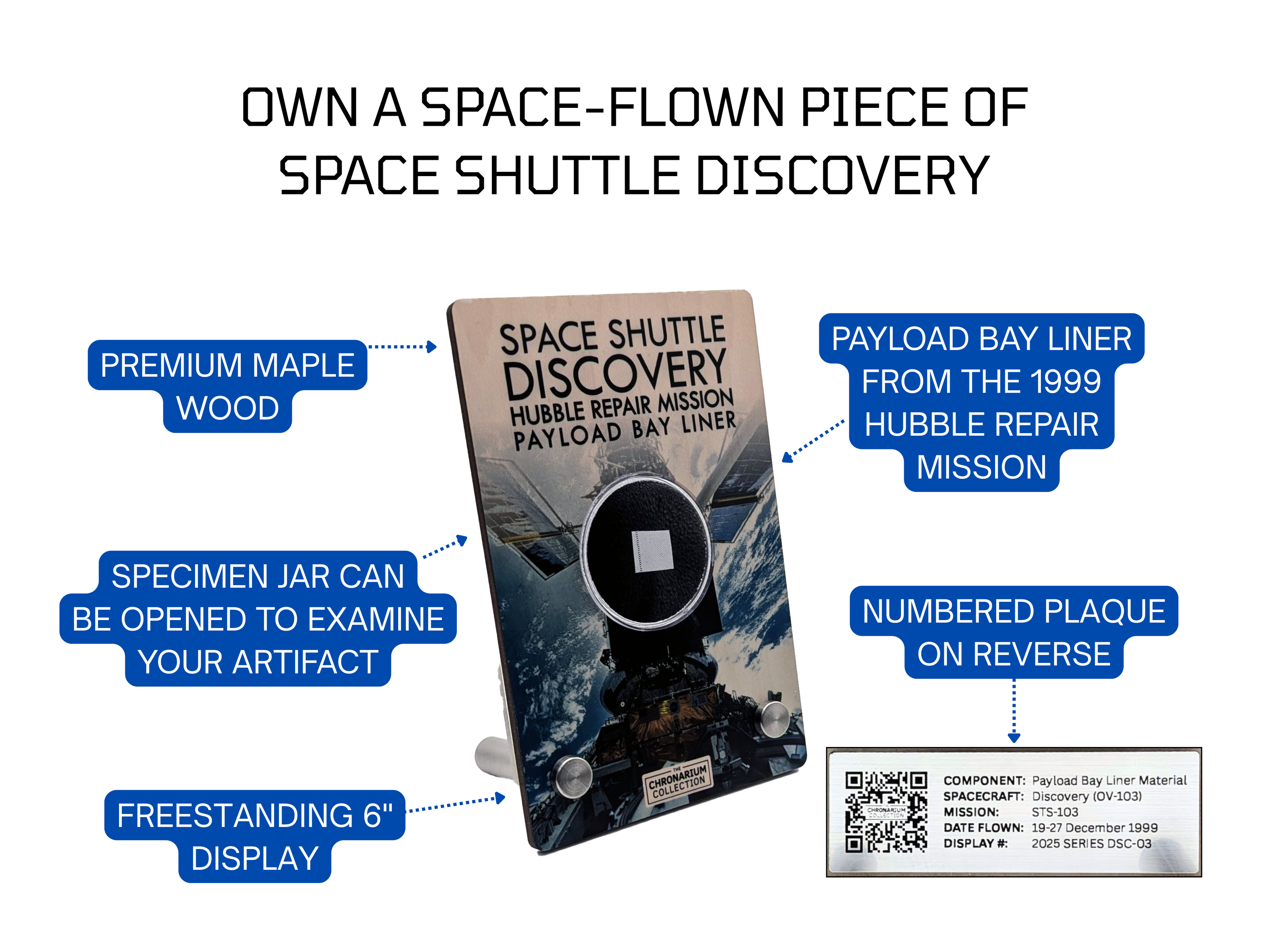 This specimen is a fragment from the space-flown payload bay liner of Space Shuttle Discovery's 1999 Hubble Repair Mission.Β