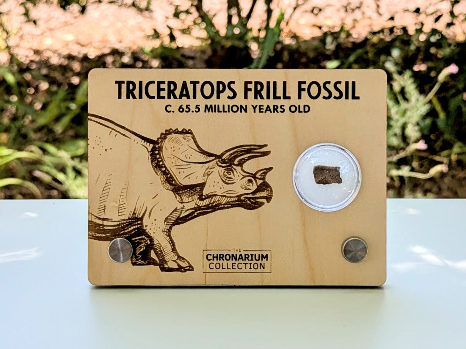 Each engraved 5.5" wood display includes a fragment of authentic fossilized triceratops frill, uncovered in the Hell Creek Formation of North America. Fragments vary a small amount in size and shape, but will be roughly 1/2" in size. Bring home a crown of bone from a bygone world—an awe-inspiring addition to any collection.