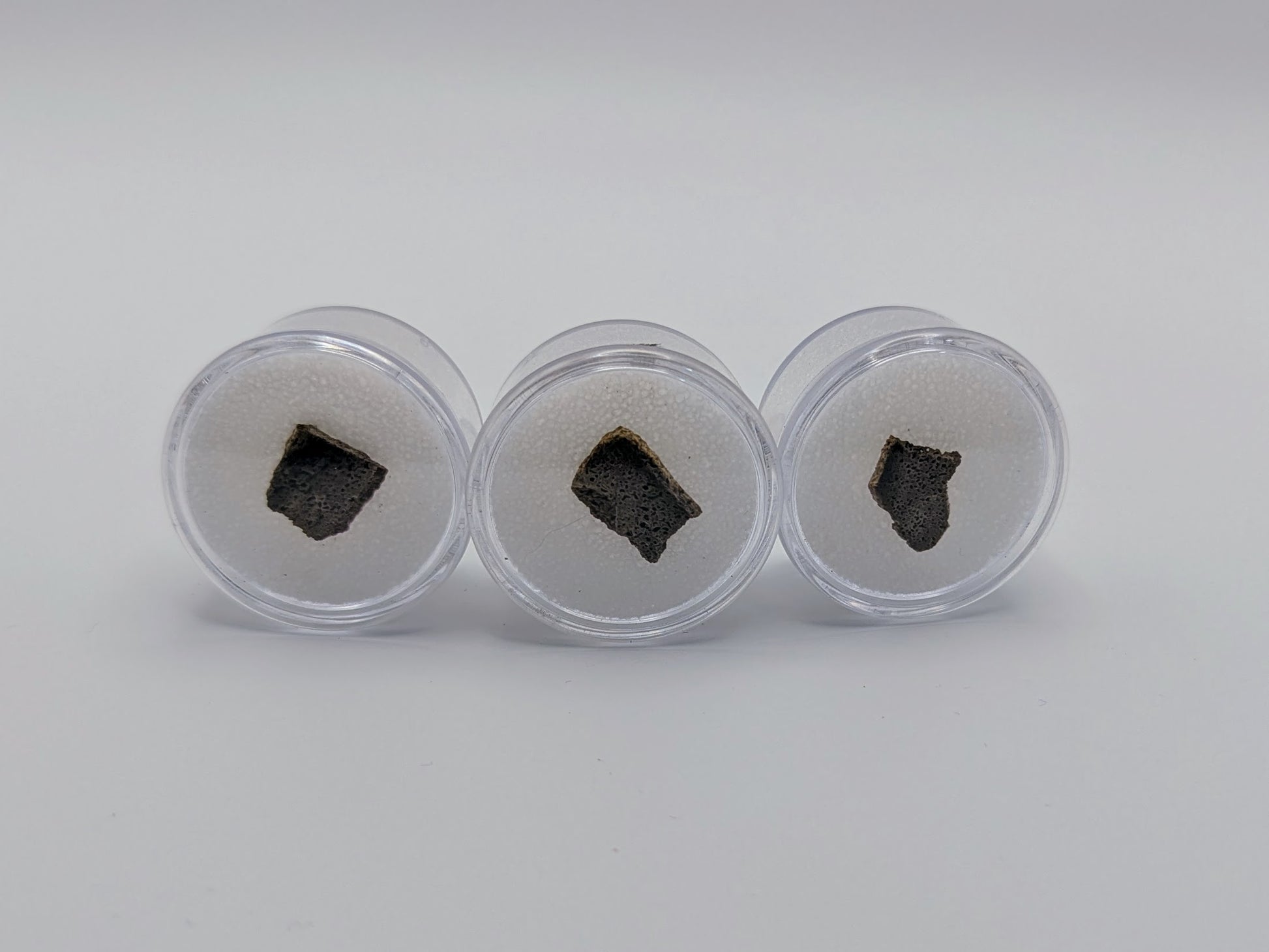 Each specimen is enclosed in a clear protective jar backed by soft foam, which you can open to examine your piece of history.