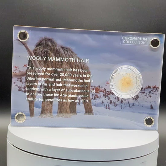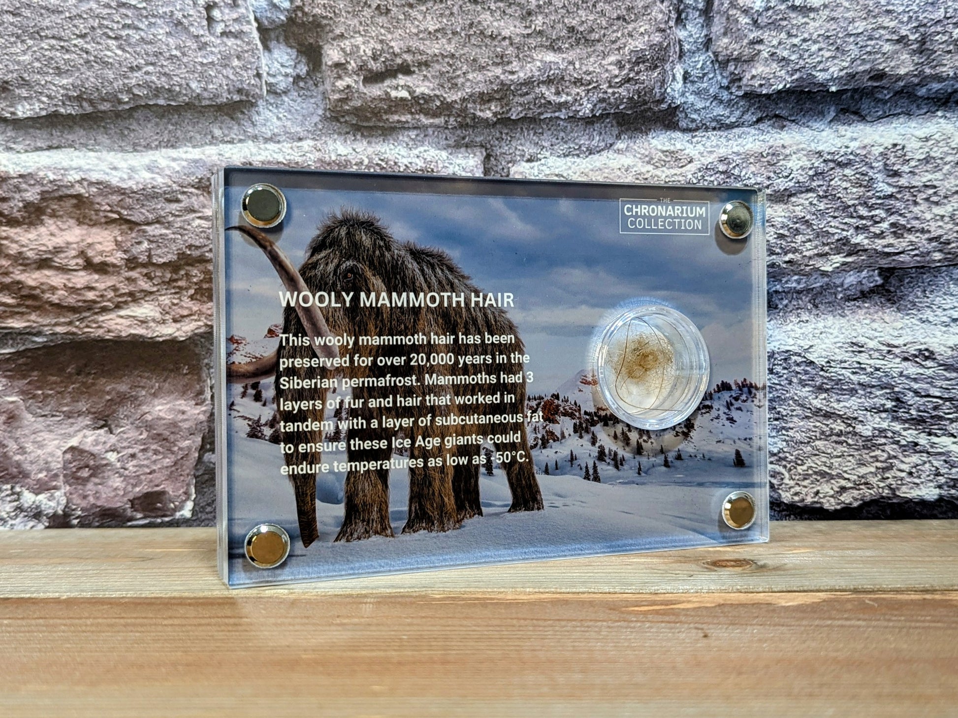 Hold a tangible link to the Ice Age with this genuine sample of woolly mammoth hair, which has been preserved in the Siberian permafrost for roughly 20,000 years. Each small bundle is housed in an acrylic display with removable clear jar, perfect for study or display.
